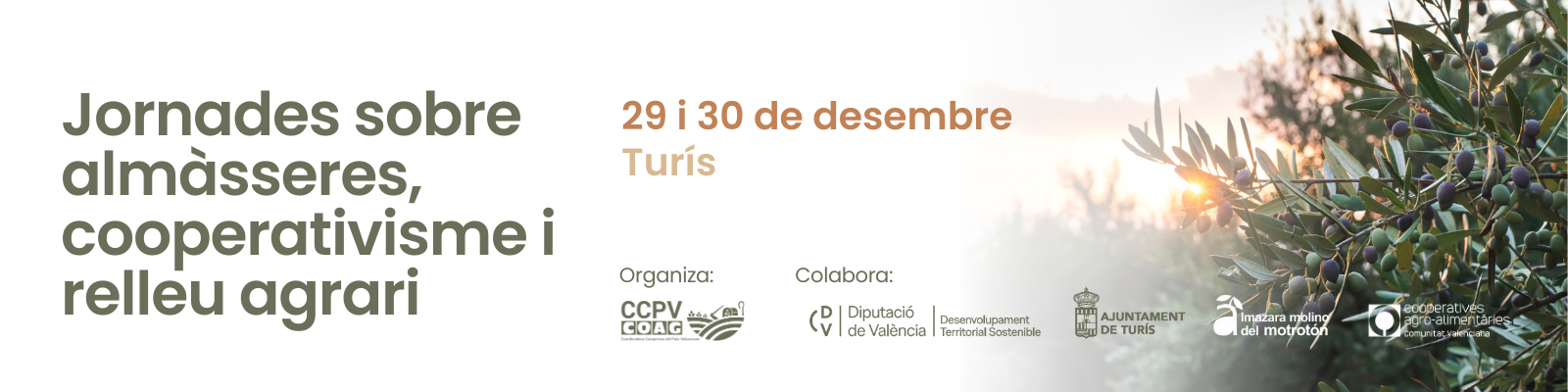 a Coordinadora Campesina del País Valenciano (CCPV-COAG) organiza los días 29 y 30 de diciembre, en Turís, las Jornadas sobre almazaras, cooperativismo y relevo agrario, con el objetivo de analizar el papel del cooperativismo en el sector oleícola y afrontar los retos actuales del campo valenciano, como por ejemplo el relevo generacional, la gestión de la tierra y la sostenibilidad de las explotaciones.