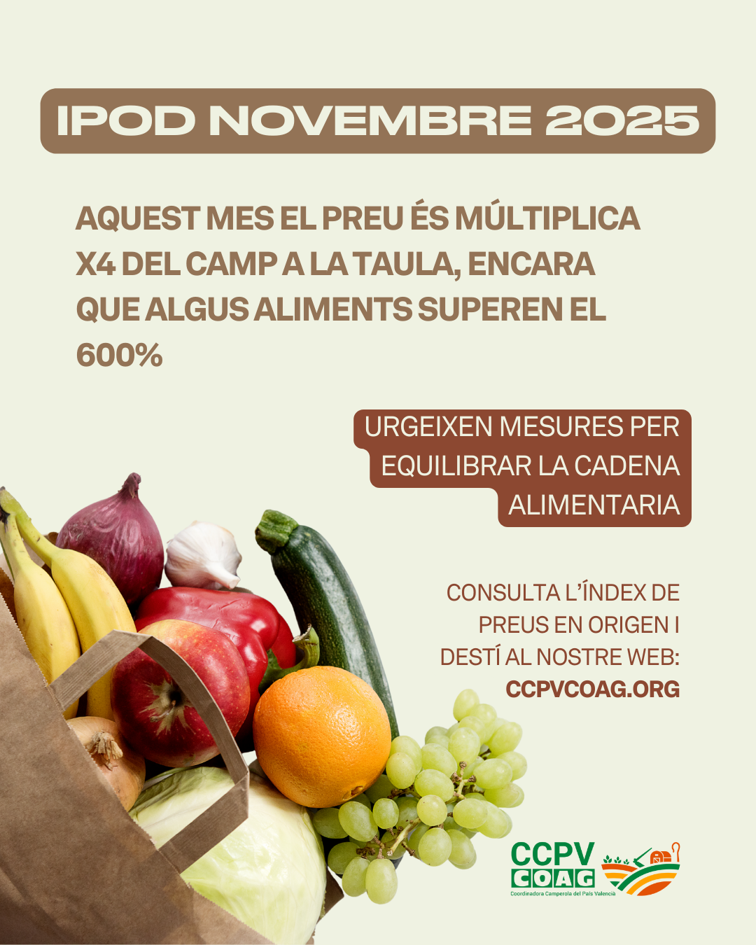 El Índice de Precios en Origen y Destino de los Alimentos (IPOD) correspondiente al mes de noviembre de 2025 se sitúa en 4,00, lo que significa que el precio de los alimentos se multiplica por cuatro desde que salen del campo hasta que llegan al consumidor final.