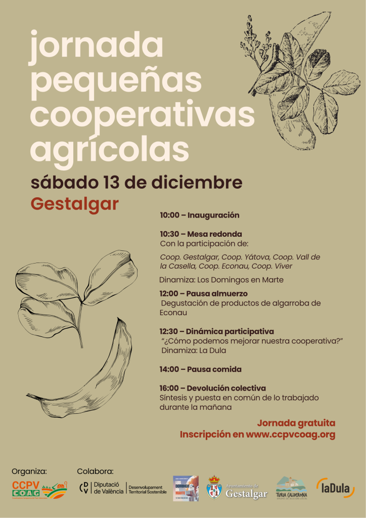 Desde la Coordinadora Campesina (CCPV-COAG) organizamos la Jornada sobre pequeñas cooperativas agrarias, el sábado 13 de diciembre en Gestalgar, un encuentro destinado a reflexionar sobre el papel fundamental que desempeñan estas entidades en la estructura económica, social y cultural de los municipios del interior de Valencia.
