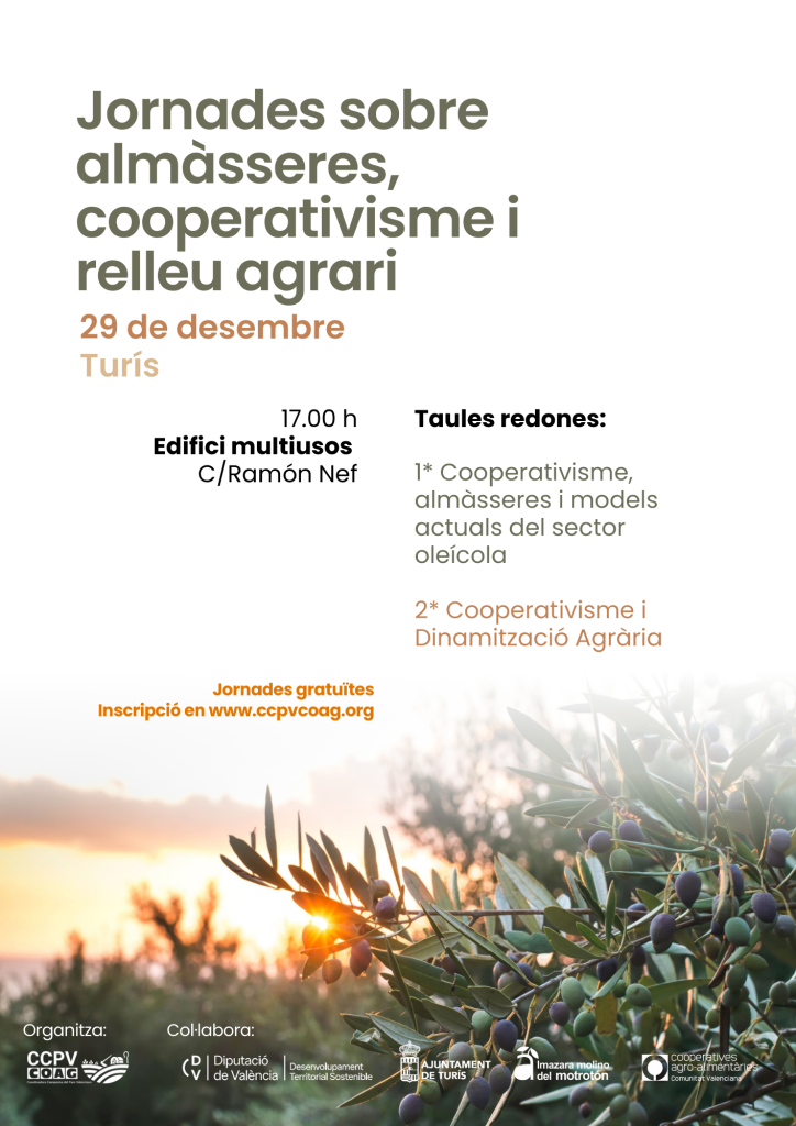 La Coordinadora Camperola del País Valencià (CCPV-COAG) organitza el dilluns 29, a Turís, les Jornades sobre almàsseres, cooperativisme i relleu agrari, amb l’objectiu d’analitzar el paper del cooperativisme en el sector oleícola i afrontar els reptes actuals del camp valencià, com ara el relleu generacional, la gestió de la terra i la sostenibilitat de les explotacions.